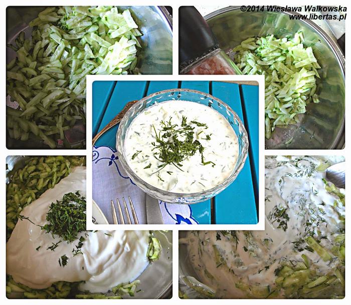 Obierz ogórki i zetrzyj na tarce tak, jak lubisz (plastry, słupki, grube oczka). Posól je i odstaw na 10 minut. Po tym czasie lekko ogórki odsącz, dodaj pozostałe składniki, wymieszaj i dopraw do smaku.