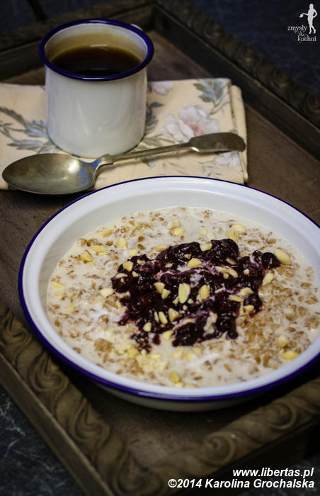 A jak wykonać smaczną owsiankę? Ja jestem zwolenniczką dorodnych, lekko spłaszczonych płatków owsianych, a nie owsianek błyskawicznych – co więcej, skłonna jestem uważać, że Ci, którzy nie lubią owsianki, próbowali tylko tej błyskawicznej. Tymczasem owsianka z dorodnych, nisko przetworzonych płatków owsianych czy orkiszowych (mój absolutny faworyt!) to żadna tam papka! No i syci na dłużej. Klasyczna owsianka przygotowywana jest z mieszanki płatków (1 część) i mleka lub/i wody (3 części), plus obowiązkowej szczypty soli – bez niej owsianka jest płaska w smaku. Dodatki wedle uznania: świeże lub suszone owoce, konfitury, sosy owocowe, miód, masło, cukier, bakalie, orzechy, a nawet kawałki czekolady. Podkręcić można ją przyprawami: imbirem, cynamonem, kardamonem, gałką muszkatołową. Ogranicza nas tylko nasza wyobraźnia. Ja dałam się swojej ponieść – przygotowałam owsiankę orkiszową na mleku kokosowym z korzennym sosem ze świeżych żurawin.