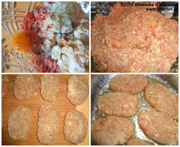 Lekko odciśnij i rozdrobnij kajzerkę namoczoną w mleku, zetrzyj na tarce cebulę, przeciśnij przez praskę czosnek i dodaj wszystko do mięsa. Następnie dodaj pozostałe składniki i dobrze wymieszaj. Konsystencja powinna być dość „luźna”.