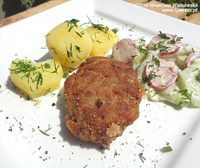 Z powstałej masy formuj owalne kotlety i delikatnie obtaczaj w bułce tartej. Kładź na rozgrzany tłuszcz i smaż na złoto z każdej strony (po kilka minut). Usmażone kotlety odkładaj na papierowy ręcznik.