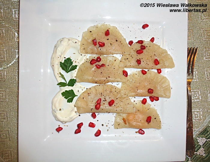 Posypałam pierogi ziarnami granatu i delikatnie oprószyłam pieprzem. Dodałam również jogurt wymieszany z posiekanym tymiankiem i odrobiną pieprzu.