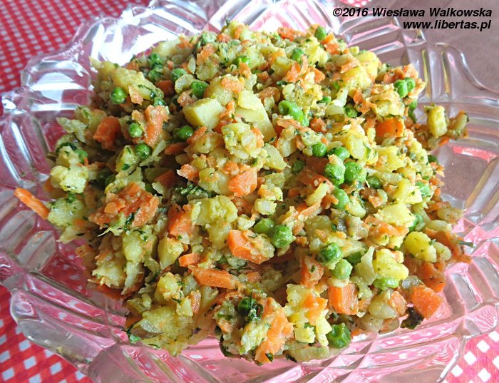 Ugotuj ziemniaki w mundurkach, obierz i pokrój w grubą kostkę. Ugotuj marchewkę i pietruszkę do miękkości i pokrój w drobną kostkę lub zetrzyj na tarce z grubymi oczkami. Ugotuj groszek na parze (około 5–6 minut). Pokrój cebulę w drobną kostkę i sparz ją wrzątkiem. Wymieszaj wszystkie warzywa.
