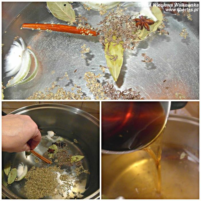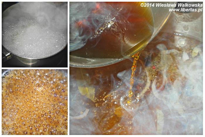 Do około 2 litrów wody dodaj wszystkie przyprawy bez octu oraz rodzynek i gotuj na wolnym ogniu około 20–30 minut. Do zalewy dodaj karmel, zagotuj, a następnie dodaj ocet i rodzynki. Po 10–15 minutach, jeszcze ciepłą zalewę dodaj do usmażonych śledzi. Tak przygotowane śledzie powinny się macerować przez 2–3 dni.
