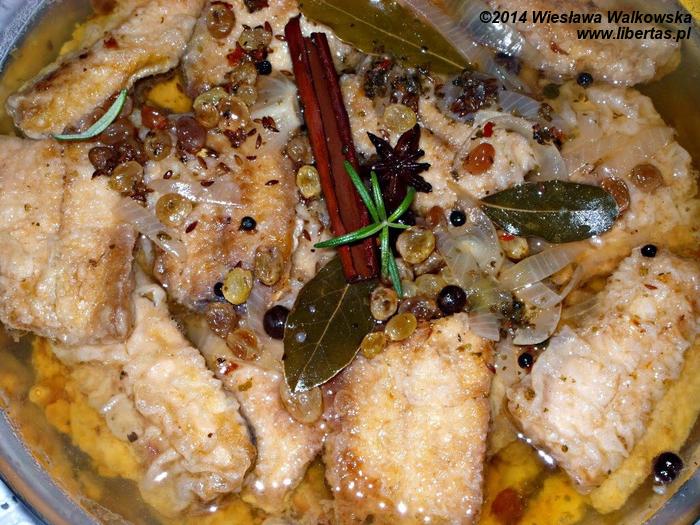 Usmażone odkładaj na ręczniku papierowym, a następnie ułóż w misce warstwami i zalej gorącą zalewą.