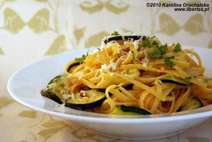 Cukinie umyłam, osuszyłam i pokroiłam na dość cienkie plasterki. Usmażyłam je na rozgrzanej oliwie, delikatnie mieszając tak, by nie porozrywać cukinii. Czosnek obrałam i drobno posiekałam. Na ostatnią minutę smażenia cukinii dodałam czosnek. Uważałam, aby obu nie zbrązowić - cukinia wtedy nie wygląda ładnie, a czosnek jest gorzki.