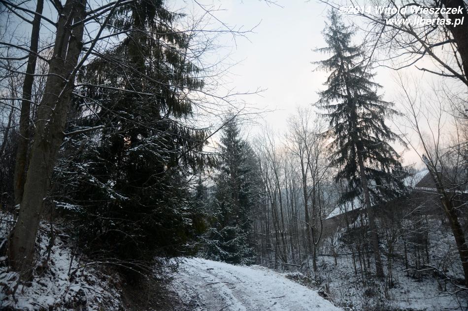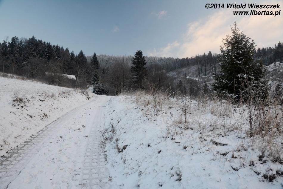 Niebieski szlak zaczyna się niemal zaraz przy stacji PKP, więc odnalezienie go nie powinno nikomu nastręczać żadnych problemów. Niestety początkowo czeka nas marsz asfaltową drogą przez Rajczę, ale po kilkunastu minutach wejdziemy na drogę polną. Mijamy ostatnie zabudowania i zaczynamy trawersować wzgórze. Szlak jest dobrze oznaczony, ale w zimie zdarza się, że śnieg oblepia drzewa i oznaczenia ukrywa, więc należy się uzbroić w czujność i zdrowy rozsądek.