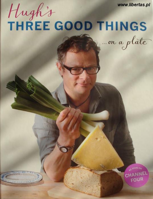 Trzy dobre rzeczy na talerzu – czy to brzmi banalnie? Nie mylcie tego przypadkiem z przepisami z trzema składnikami. To nie o to chodzi. Hugh sięgnął bowiem po formułę wymieszania w jednym daniu trzech składników o odmiennych smakach czy konsystencji, aby stworzyć krótkie przepisy (ale nie trzyskładnikowe; oprócz tych trzech głównych występują też inne) niewymagające ani wymyślnych składników (często składniki są bardzo skromne), ani godzin przygotowania czy specjalistycznego sprzętu. Podczas lat swojej pracy, eksperymentowania w kuchni Hugh poznał tyle możliwych kombinacji składników, że zdążył już sprawdzić, co działa, a co niekoniecznie warte jest łączenia. I to co według niego ze sobą dobrze współgra przedstawił w tej książce w formie 175 przepisów.