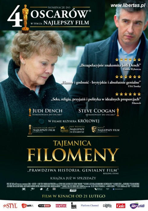 Przekład angielskiego tytułu na plakaty i terminarze kinowe w Polsce razi i nie zachęca. W oryginale to „Philomena”. Spolszczenie imienia i dodanie słowa „tajemnica” jest pretensjonalne. Właśnie zachowanie oryginału wyrażałoby zagadkę, nawet enigmę. A film przecież nie ma nic wspólnego z afektacją, egzaltacją. Rzecz dzieje się za rządów Blaira i pierwsze sceny filmu, gdy poznajemy, a wcześniej przeczytaliśmy tylko drobną notkę na temat fabuły, Philomenę i Martina, sprawiają, że nawet nie podejrzewamy, ale jesteśmy przeświadczeni o związku obu tych postaci. Nie ma wątpliwości, że to główni bohaterowie. Jednak aspekt jest inny. Owa tytułowa tajemnica ma właśnie ich dotyczyć. Inaczej: zostanie rozwiązana w początkach obrazu, zaś fabuła stanie się ciągiem rozwiązywania poplątanych relacji i stosunków matki i syna, które pięćdziesiąt lat wcześniej system fundamentalnie katolickiej Irlandii, jakże bliski obłudnym wiktoriańskim schematom, zawiązał w gordyjski węzeł. W dalszej części będziemy zapewne obserwowali, płakali, smucili się, denerwowali końcową niewiadomą. Radość czy nieszczęście? Będzie zakończenie hollywoodzkie, czy dramat? A może gorzki uśmiech?