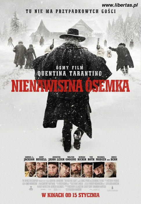 Spotkałem się w komentarzach do „Nienawistnej ósemki”, że jest nieciekawa i nużąca. W którymś z programów radiowych mówiono o kiepskim tym razem dziele Tarantino. Nic podobnego! W trzy lata po westernie „Django” reżyser postanowił nie zajmować się innym gatunkiem, lecz przeniósł akcję z Południa Stanów Zjednoczonych na Północ. Skwarne słońce, plantacje, duszącą wilgoć zamienił na zamieć śnieżną Wyoming, przez którą przebija się dyliżans jadący do Red Rock (a widz już ma przed oczami „Red Rock West” Johna Dahla z Nicolasem Cagem w roli głównej). Rozmowy prowadzone przy fruwających skórzanych zasłonkach pojazdu przypominają te z „Pulp Fiction”, nie tylko, dlatego że jednym z pasażerów jest Samuel L. Jackson. Frytki z ketchupem czy majonezem zastąpione zostały przez dyskusję o aktualnej polityce tuż po zakończonej wojnie secesyjnej. W niej zaś niepoślednią rolę odgrywa pewna korespondencja prowadzona między czarnym łowcą nagród a amerykańskim prezydentem. Johna Travoltę zastępuje, jako adwersarz Jaksona wyśmienity Kurt Russell, „Wisielec”. Jednak to jeszcze nie są szczyty fantazji, ironii i sarkazmu reżysera! Uważny widz doliczy się w dyliżansie (i na nim) ośmiu osób, hmm… w tym ciał. Dla samej przyjemności warto, co kilka scen, przeprowadzać podobny rachunek.