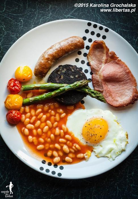 Ach, jaka jestem zmęczona! Ogólnie, gdyż nie śpię od piętnastu miesięcy, ale także marudzeniem tutejszej Polonii i narzekaniami na tę straszną angielską kuchnię. A że tłusto, a że kiełbaski smakują jak papier, a że jak można fasolkę na śniadanie, a już w ogóle kaszankę (i to tę ich suchą!) i tak dalej. A im bardziej drążę temat, tym bardziej wychodzi na jaw, że ci narzekający kupują produkty słabej jakości albo stołują się w sieciówkach przy autostradach. To chętnie posłuchałabym opinii cudzoziemców na temat tej strasznej polskiej kuchni, gdyby zaserwowano im serdela z geesu z chlebem z margaryną. Pretensje można mieć do siebie za zły wybór produktów lub/i za ich złe przygotowanie. Nie twierdzę, że wszystko jest cacy, nie twierdzę, że angielskie śniadanie jemy 5 razy w tygodniu, ale w niedzielny poranek na lekkim kacu, który zdarzył nam się w domu pierwszy raz od ponad roku (prawdziwa historia!), to chyba było najlepsze rozwiązanie. Dobrej jakości tradycyjnym śniadaniem dogadzamy sobie zresztą co parę tygodni, kac nie jest obowiązkowy.