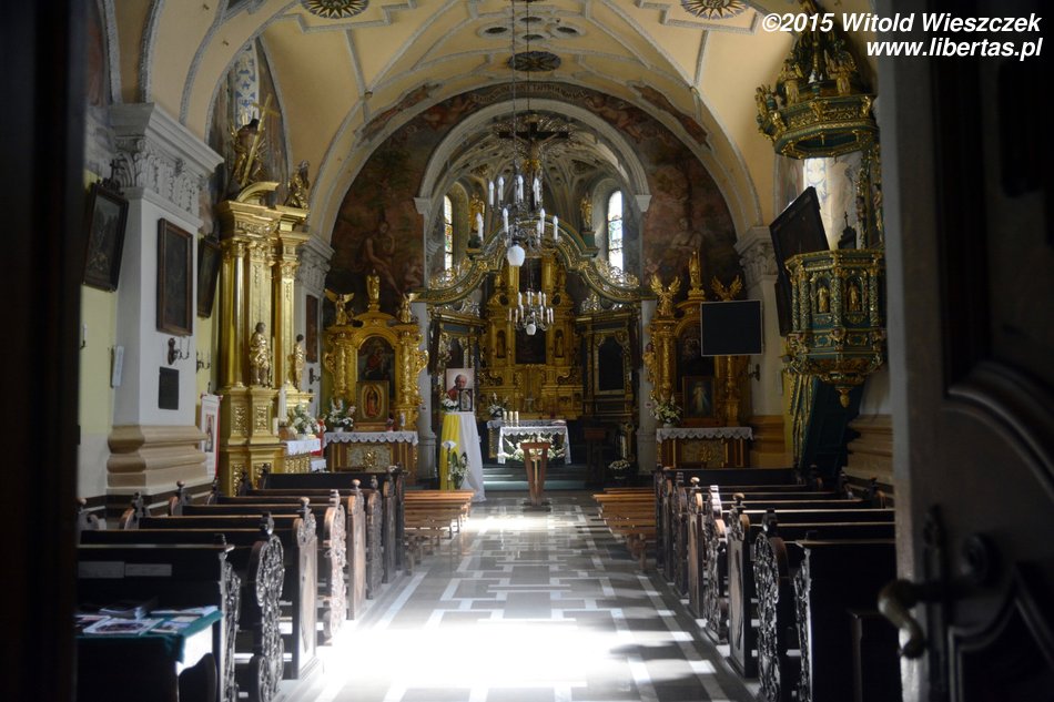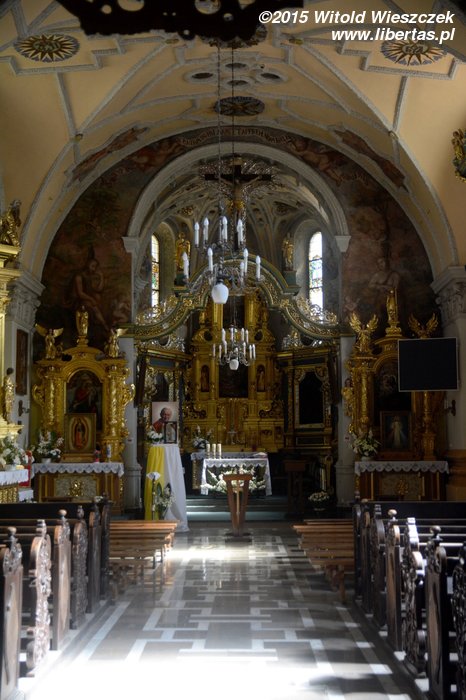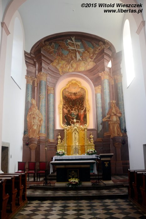 Wnętrze kościoła jest dość surowe. Najbardziej zwrócił moją uwagę późnobarokowy iluzjonistyczny ołtarz główny wymalowany na ścianie parawanowej, w którego centrum widoczny jest XVIII-wieczny obraz Zesłanie Ducha Świętego. Chyba nigdy wcześniej takiego ołtarza nie widziałem. Pod obrazem widać rzeźbione rokokowe tabernakulum.