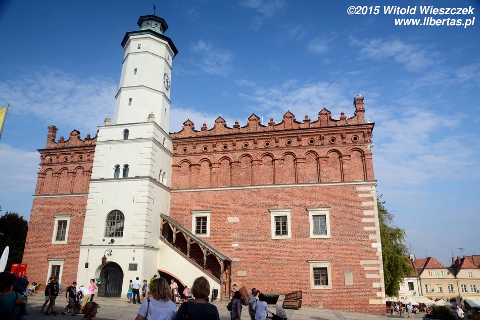 Stojący w centrum Rynku dumny Sandomierski ratusz jest jednym z najpiękniejszych takich budynków w Polsce. Wzniesiony na planie kwadratu w połowie XIV wieku był początkowo zwieńczony wysoką, ośmioboczną wieżą. Na tej najstarszej części widzimy zegar słoneczny wykonany w roku 1958. Pod koniec XV wieku ośmioboczną wieżę rozebrano, rozbudowując ratusz w kierunku północnym, a w XVI wieku zwieńczono go renesansową attyką. Przylegająca wieża została dobudowana na przełomie XVI i XVII wieku. Podczas pożaru w roku 1623 ratusz został poważnie zniszczony, zaś wieża ratuszowa runęła, ale za czasów Władysława IV ratusz i wieżę odbudowano. Później jeszcze niejednokrotnie budynek płonął, ale za każdym razem prędzej czy później był odbudowywany. Obecnie znajduje się tu oddział Muzeum Okręgowego oraz reprezentacyjne sale Rady Miasta i Urzędu Stanu Cywilnego, w piwnicach zaś mieści się klub „Lapidarium” Sandomierskiego Stowarzyszenia Kulturalnego.