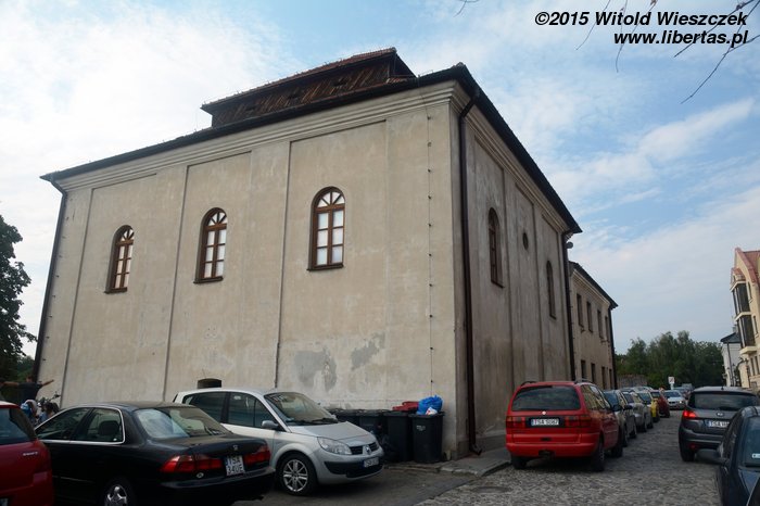 Stojąca przy ulicy Żydowskiej dawna synagoga została zbudowana w roku 1768 na miejscu wcześniejszych, których historia sięga być może jeszcze czasów Kazimierza Wielkiego. Jest to późnobarokowy budynek wzniesiony z cegły w obrębie średniowiecznych murów miejskich. We wnętrzu zachowały się XVIII-wieczne polichromie. Niestety nie można ich oglądać, ponieważ w budynku znajduje się obecnie siedziba Archiwum Państwowego niedostępna dla zwiedzających.