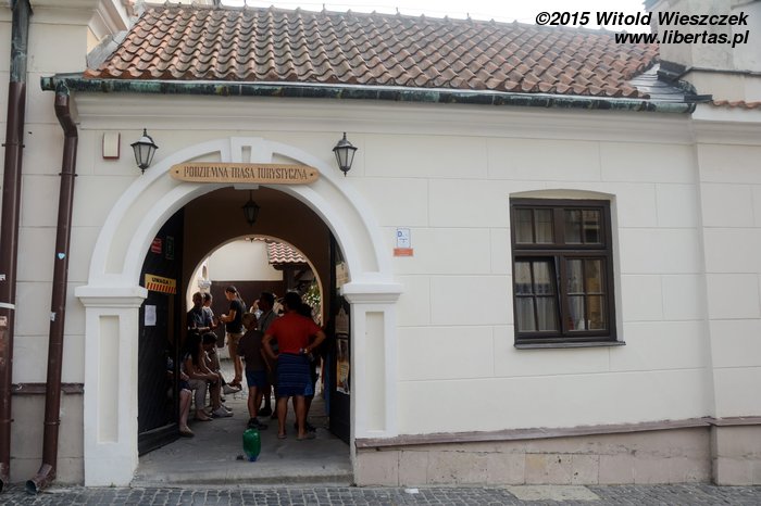 Kilkadziesiąt metrów za bramą, po lewej stronie, znajduje się kościół św. Ducha. Pierwsza, drewniana jeszcze świątynia ufundowana w XIII wieku przez kasztelana krakowskiego Żegotę herbu „Topór” spłonęła w czasie najazdu Litwinów w roku 1349. Odbudowana została pod koniec XIV wieku w stylu gotyckim, później wielokrotnie niszczona, a w wieku XIX „ukryta” od strony ulicy za klasycystyczną fasadą.
