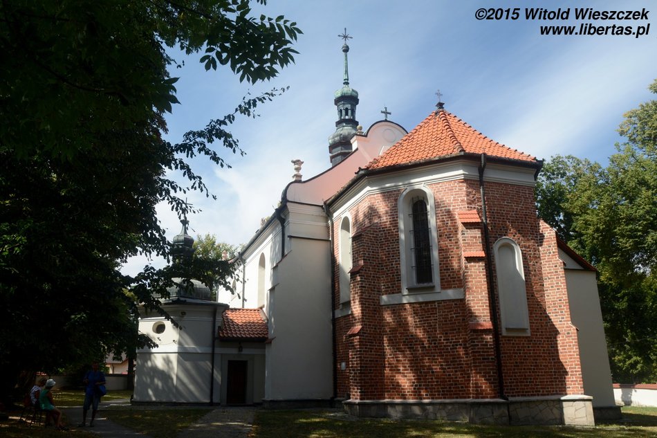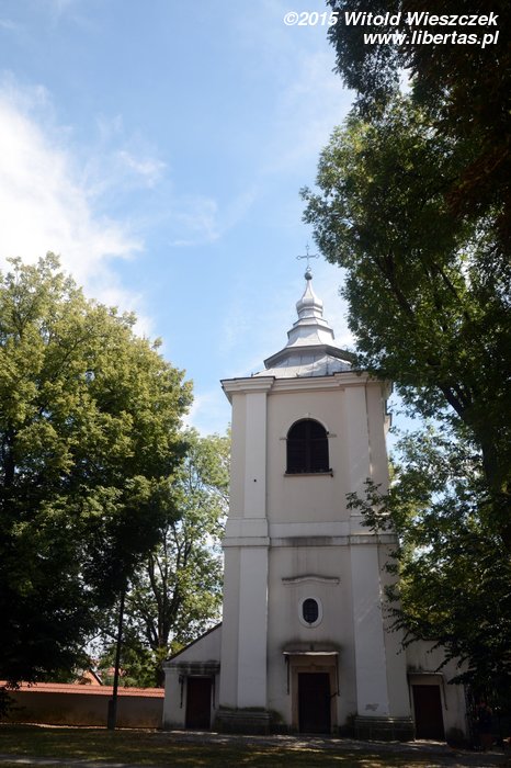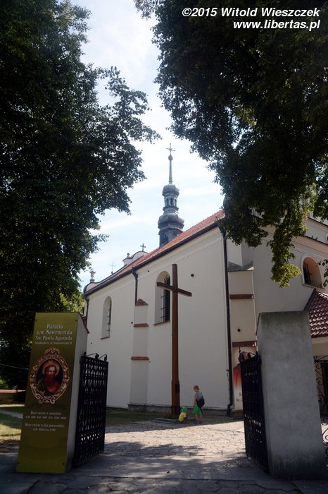 Murowany, gotycki kościół św. Pawła zbudowano w latach 1426–1434 na miejscu wcześniejszej, drewnianej świątyni ufundowanej w 1226 roku przez biskupa Iwo Odrowąża. W XVII wieku kościół powiększono od strony zachodniej, a na początku wieku XVIII dobudowano od południa kaplicę św. Barbary. Wtedy też świątynia otrzymała obecny, barokowy wystrój, między innymi piękne ołtarze, rzeźby, chór organowy, stalle czy ambonę. Kościół otoczony jest starym murem, przy którym stoi barokowa dzwonnica z XVIII wieku.