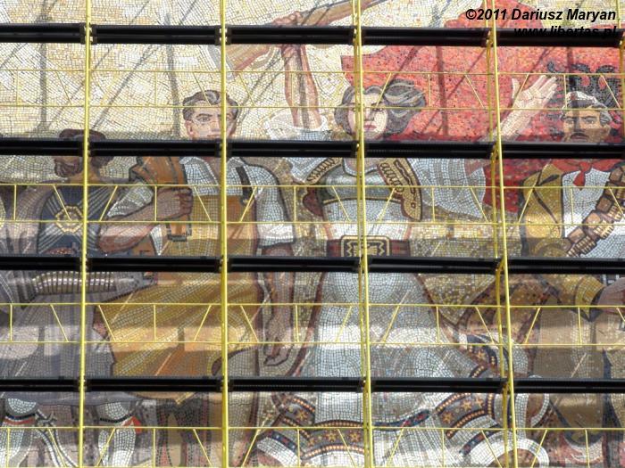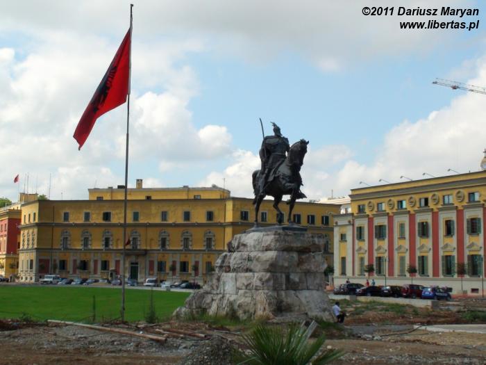 Po przyjemnie spędzonym wieczorze, poszliśmy wprost na plac Skanderbega, zobaczyć jak prezentuje się nocą. Po cichu liczyłem, że do naszego przybycia zdążą się uporać z remontem i plac nie będzie rozkopanym placem budowy. Niestety, roboty ziemne trwały w najlepsze, skutecznie psując widoki. Mozaika, na frontonie Muzeum Narodowego, była przesłonięta rusztowaniem, ale na szczęście można było ją zobaczyć (rok wcześniej zasłaniał ją baner Vodafone). Pomnik Skanderbega był odgrodzony barierkami, pomiędzy którymi robotnicy zostawili wąski przejście przez plac.
