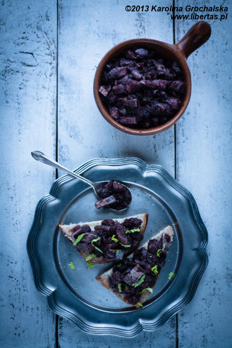 Z ostatnich zrobiłam użytek w stylu skandynawskim – wszak tam śledzie też wiodą prym. Zainspirował mnie przepis Ojca Dyrektora. Nie, nie tego z pewnego radia. Blogera i mojego imiennika, który u siebie na blogu SlowFoodzik podał przepis na duński przysmak. Ja zrobiłam to po swojemu, w formie tatara podanego na żytnim chlebie – w sam raz na przekąskę, dobre na imprezę. Mam nadzieję, że Wam się przyda w karnawale lub ot tak, po prostu.