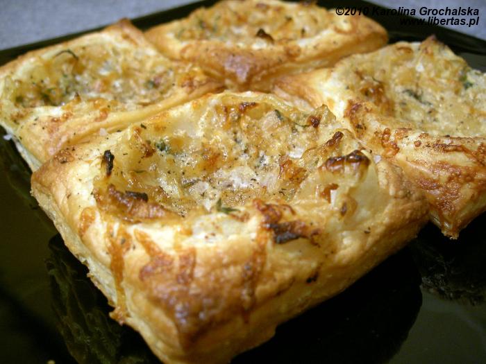 Gotowe rozwałkowane ciasto francuskie pokroić na kwadraty wielkości kęsa lub dwóch. Na maśle zeszklić pokrojoną w półplasterki cebulę. Gdy będzie miękka doprawić solą, pieprzem i dodać ulubione zioła, ja do cebuli lubię tymianek. Na każdy kawałek ciasta francuskiego położyć nieco cebuli, zachowując nieduży odstęp od brzegów ciasta i zetrzeć trochę sera o wyrazistym smaku: parmezanu, gruyere czy cheddara. Zapiec w piekarniku nagrzanym do 200 stopni, do zarumienienia brzegów ciasta. Podawać na ciepło lub zimno.