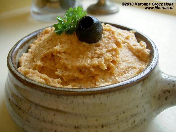 Do robota kuchennego wrzucić: odsączoną ciecierzycę puszkową (standardowa puszka, ok. 400ml), sok z połowy cytryny, ząbek czosnku, 5 pomidorów suszonych z oliwy, łyżkę tahini (pasty sezamowej), sól, świeżo zmielony pieprz do smaku i odrobinę oliwy. Miksować do momentu uzyskania gładkiej masy dolewając oliwy w trakcie miksowania - masa nie ma być zbyt zbita. Można serwować polane na górze oliwą (to przepis na klasyczny hummus bez dodatków), można udekorować świeżymi ziołami. Podawać z grillowanym pieczywem lub świeżymi warzywami pokrojonymi w słupki np, marchewką, selerem naciowym czy ogórkiem.