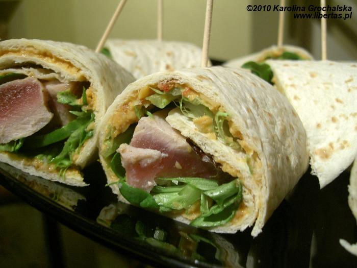Świeże steki tuńczyka pokroić na kawałki wielkości kęsa, delikatnie posolić i zmielić nieco pieprzu, posmarować oliwą, skropić sokiem z limonki lub cytryny, zgrillować na patelni, po minucie z każdej strony - tuńczyka serwuje się różowego w środku. Placki kukurydziane - tortille - lekko pogrzać w piekarniku, mają być miękkie, a nie chrupiące - przepis powinien być na opakowaniu. Każdy placek posmarować hummusem, ułożyć na nim kilka listków ulubionej sałaty (chrupiąca lodowa jest OK), kilka plasterków świeżego ogórka, na każdy plasterek ogórka po kawałku tuńczyka. Zwinąć w roladkę i przebić tyloma wykałaczkami, ile kawałków tuńczyka zmieścicie na placku kukurydzianym. Pokroić na kawałki, między kawałkami tuńczyka. Można serwować letnie lub zimne.