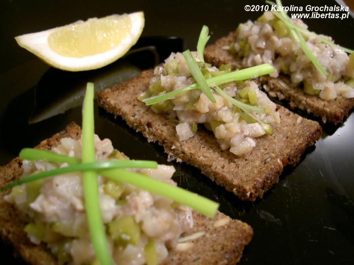 Świetnie nadaje się do jego serwowania albo pumpernikiel, albo innych chleb żytni cienko krojony. Użyjcie swojego ulubionego śledzia. Odsączcie z zalewy, jeśli solone, to odmoczcie, a potem posiekajcie drobno. Wymieszajcie z drobno posiekanymi: korniszonami, pieczarkami marynowanymi, ogórkiem kiszonym, cebulą, dymką, oliwkami, świeżą chilli. Do wyboru do koloru - to zależy jakie połączenia smakowe lubicie, sami zdecydujcie co dodać do śledzia, byle nie wszystko na raz. Doprawić solą i pieprzem. Tatar należy rozłożyć na małych kawałkach chleba i udekorować dymką lub świeżą pietruszką czy koperkiem. Podawać w towarzystwie ćwiartek cytryny.
