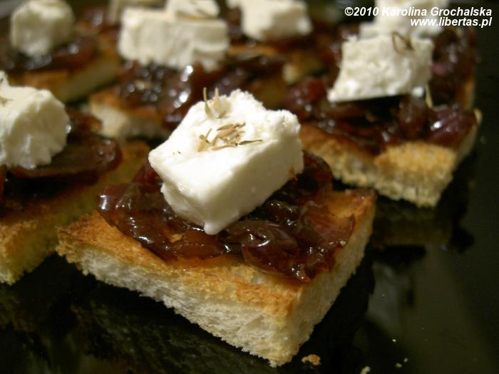 Najlepiej zużyć do nich jedno-dwudniowy chleb. Odkroić skórkę a miąższ pokroić na małe kwadraty, takie wielkości kęsa. Cebulę czerwoną zeszklić na maśle, aż będzie miękka. Sypnąć nieco brązowego cukru i chlusnąć troszkę octu balsamicznego. Nie przesadzać z tymi składnikami, cebula jest naturalnie słodka i nie ma pływać w occie. Trzymać na małym ogniu, aż większość płynu wyparuje, a cebula będzie lepka. Można użyć karmelizowanej cebuli ze słoika, ale trzeba ją zrobić co najmniej cztery tygodnie wcześniej, aby dojrzała i smaki się przegryzły). Na kawałki podpieczonego w piekarniku chleba położyć nieco cebuli, na to po kawałku fety lub innego wyrazistego sera, np. koziego i posypać świeżym lub suszonym tymiankiem.