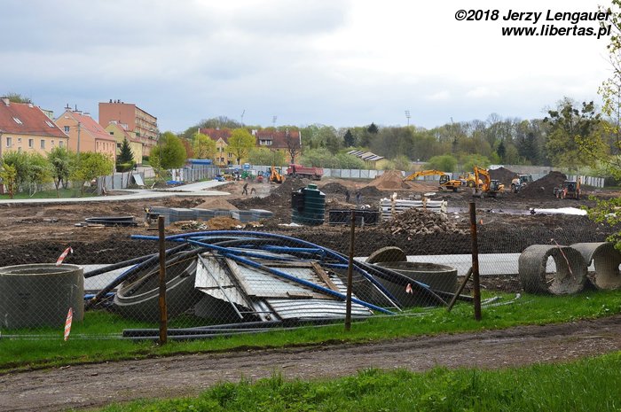 A dzieci w wesołych miasteczkach takie same jak lata temu. Teatr ludowy, teatrzyk kukiełkowy, teatr uliczny, akrobaci, magicy, szczudlarze, wesołe miasteczka, cyrkowcy. Artyści przyszli pieszo. Wozy ciągnione przez konie. Traktorom wydobywają się spaliny przez komin. Z miasta do miasta jadą kampery. Zawsze jest tak samo smutno po występie. Bez względu na to, ile dziecięcego śmiechu zbierają artyści wraz z monetami. Czy przy świecach je liczą, czy lampach naftowych, czy elektrycznych żarówkach. Bledną wówczas i poważnieją ich twarze. Bergman wprowadziłby między nich cień śmierci. U Felliniego wiatr porwałby wczorajszą gazetę. Gasną kolorowe światełka i wesołe miasteczko nie wygląda już jak choinka czy lustro w teatralnej garderobie. Nazajutrz wszystko rozpali się na nowo. Tyle że już nie na asfaltowym placu pod Świętym Jerzym, służącym za miejsce dla widowni przy muszli koncertowej. Tam stawała od strony Daszyńskiego dorosła karuzela zwana łańcuchową. Można było zrywać liście z drzew, gdy już skręciliśmy łańcuchy trzymające krzesełko, gdy już popchnęliśmy jej krzesełko w górę, jak najdalej, jak najwyżej, gdy się już zachłysnęliśmy nią, powietrzem i wirowaniem. Teraz hołdujemy tam poległym, pomordowanym i zamęczonym. Widok z diabelskiego młyna był wyjątkowy. Równy chyba tylko temu, który jest niedostępny z wieży kościołów (z jednego jest) i wieży ciśnień (w Giżycku jest). Jeziorko, stado ogierów, rozlewiska… Cud wiosny i jesieni na innym asfaltowym placu używanym przez resztę miesięcy jako plac manewrowy nauk jazdy. Teraz tam parking, toalety zwykle zamknięte, amfiteatr. Jeszcze miesiące temu na tej łące z zarośniętym stawem wymieniały się cyrki i wesołe miasteczka. Teraz na Poznańską wjechały koparki, zrzucono kostkę brukową i tony piasku. Gdy robiłem zdjęcia do tego tekstu, z koparki wyszedł jegomość i spytał: „Gościu, kto ci pozwolił robić zdjęcia?”. Tak, teraz jestem tam gościem. Czterdzieści kilka lat temu przychodziłem tam z matką i ojcem się opalać. Jestem gościem. Gośćmi też będą mieszkańcy poniemieckich robotniczych kamienic zza jezdni. Zgasną garderobiane żarówki. Sine, oszczędne światła latarni oświetlą betonową kostkę.