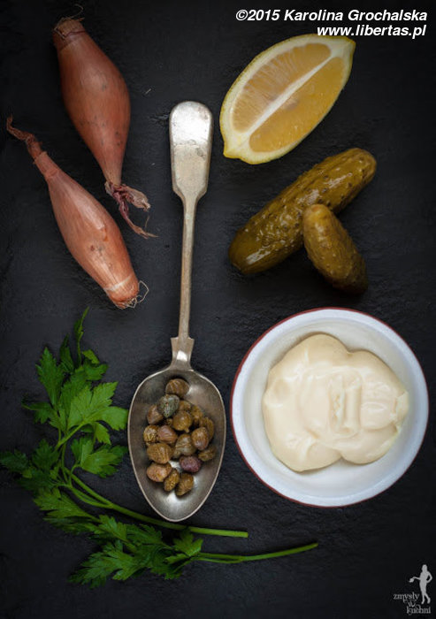 Korniszony posiekać na niewielką kostkę. Szalotkę obrać i pokroić na drobną kostkę. Kapary drobno posiekać. Natkę pietruszki drobno posiekać. Wszystkie te składniki wymieszać z majonezem, sokiem z cytryny i doprawić solą i pieprzem. Zostawić na godzinę w lodówce, aby smaki się przeniknęły.
