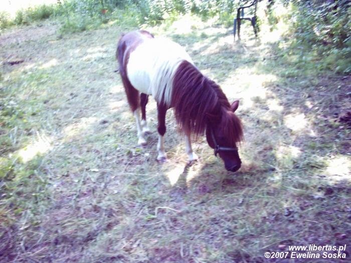 Przyjechałam, zobaczyłam wystraszone, zagubione zwierzę, które potrzebowało trochę czasu aby się zaaklimatyzować w nowych warunkach. Nie wiem jak on sobie teraz z tym radzi, ale pamiętam te momenty kiedy coś nowego, nieprzewidzianego pojawiało się na jego drodze. Należał do tych zwierząt, że musiał do tego czegoś podejść, zobaczyć to, obwąchać i dopiero później mógł pójść dalej. I jeszcze jedno, czego na początku nie mogłam zrozumieć, bo do tej pory żaden koń czy kucyk tak mi się nie zachowywał. Zrozumiałam to dopiero po jakimś czasie. Przy podnoszeniu jednej tylnej nogi kucyk dosłownie kładł się na mnie i nie pozwalał tej nogi podnieść. Po konsultacji z moim kolegą powzięliśmy podejrzenia, że to małe stworzenie było przez kogoś ćwiczone do tak zwanego rodeo i to ten ktoś ćwiczył to w taki sposób, że zostawiło to ślad na psychice konika. Trochę to trwało zanim wzajemnie sobie zaufaliśmy. Teraz też mierzyliśmy się wzrokiem nie wiedząc czy mamy się traktować jak przyjaciele czy jak wrogowie. Historia tego kucyka jest trochę inna niż tych wszystkich bitych, głodzonych czy wykorzystywanych w inny sposób. A jednak ta historia również należy do dziedziny rzeczy nie przemyślanych. U swojego gospodarza miał dobre miejsce, nie brakowało mu jedzenia oraz możliwości wybiegania się. A ja darowałam mu uczucie i swój czas na leciutki trening.