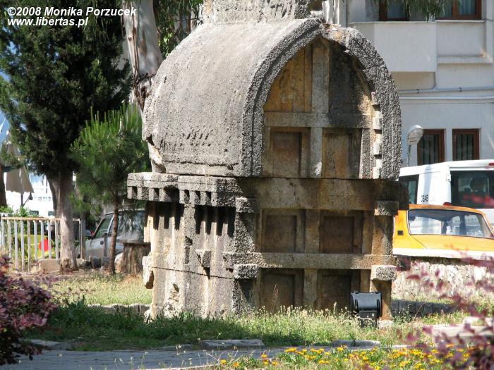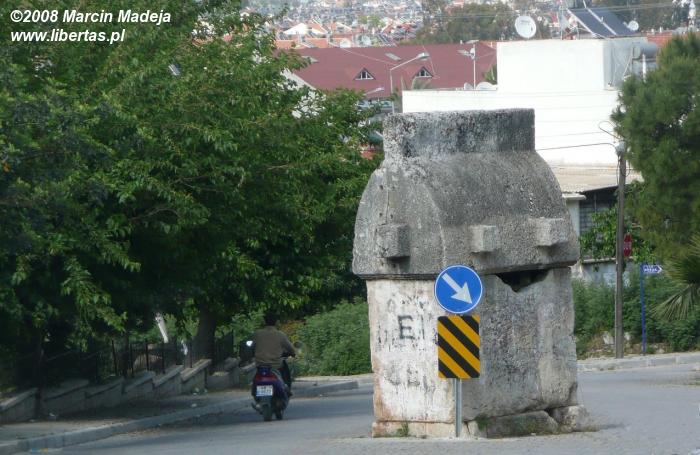Na terenie miasta Fethiye odnajdujemy jeszcze inne zadziwiające obiekty... kamienne sarkofagi. Stoją sobie po prostu w środku miasta i nikomu nie przeszkadzają. Jeden z nich stoi nawet na środku ulicy tworząc małe rondo. To część historii i kultury tego miasta i nikomu nie przyszło nawet do głowy, żeby je przestawiać w inne miejsce.