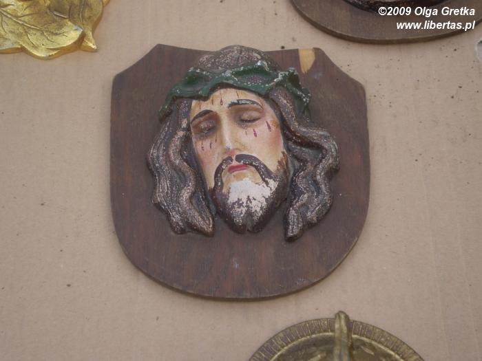 Czas na prezent dla starszej, religijnej babci: piękna, rzeźbiona w drewnie twarz Chrystusa umęczonego. Też do podczyszczenia i ewentualnie polakierowania. Jednak piękniejsza od wszystkich marketowych czy tych z manufaktury pod Jasną Górą. Plus jeśli babcia jest niemieckojęzyczna to można dorzucić żywoty świętych Pańskich z początku XX wieku.