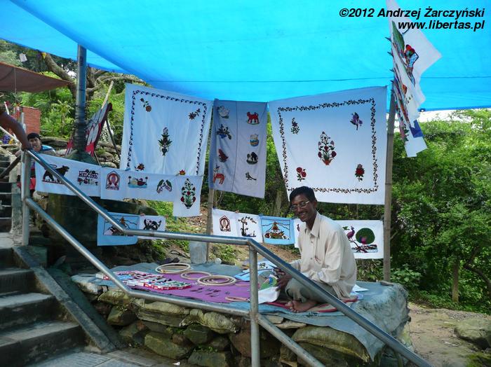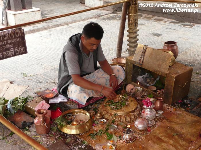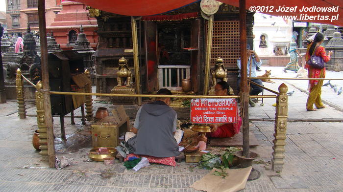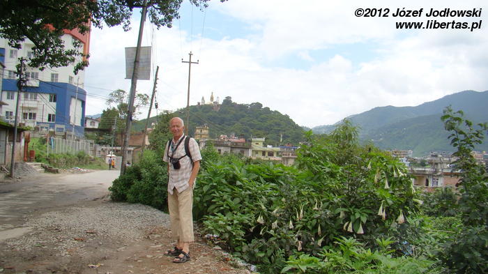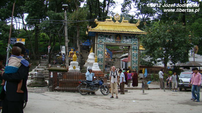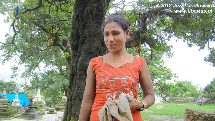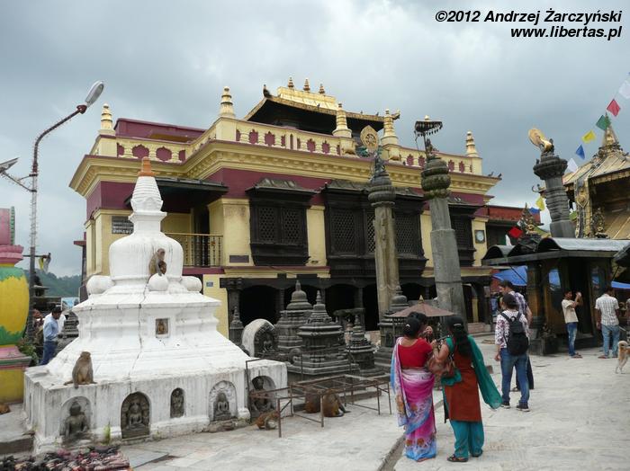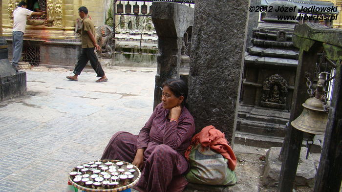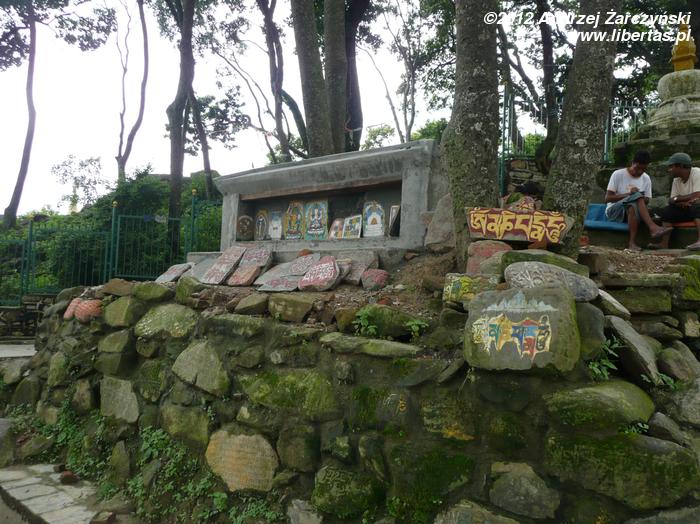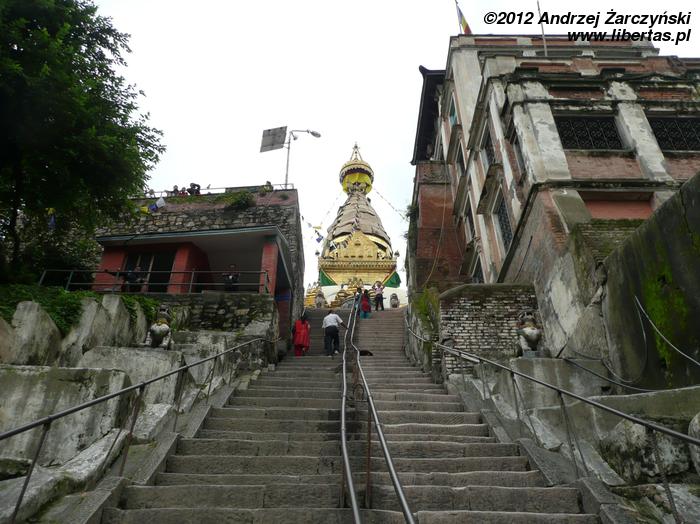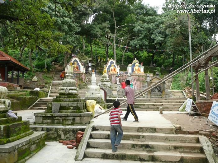 Podejście do wzgórza wąskimi uliczkami Thamelu, a później poboczami ruchliwej ulicy, nie sprawia kłopotów, tym bardziej że widok stupy towarzyszy mi przez całą drogę. Dopiero wspinaczka po 365 kamiennych schodach daje się we znaki. Do kompleksu świątynnego wchodzę przez kolorową toranę, a po drodze mijam mniejsze stupy wotywne, różnej wielkości posągi Buddy, żebraków (gorzej, że wśród nich są również dzieci) i sprzedawców wszystkiego. Usiłują wcisnąć każdemu tandetne figurki Buddy, male z rudrakszy i różnokolorowe flagi modlitewne. Na uwagę jedynie zasługują pięknie malowane i rzeźbione kamienie mani z wypisanymi pojedynczymi sylabami mocy lub całymi mantrami.