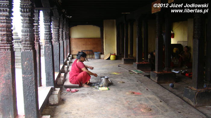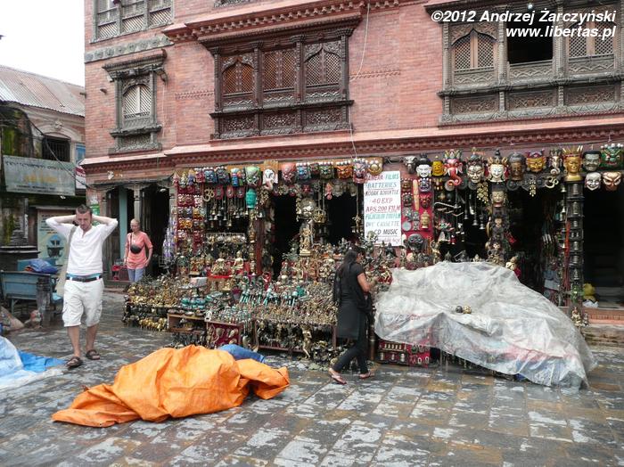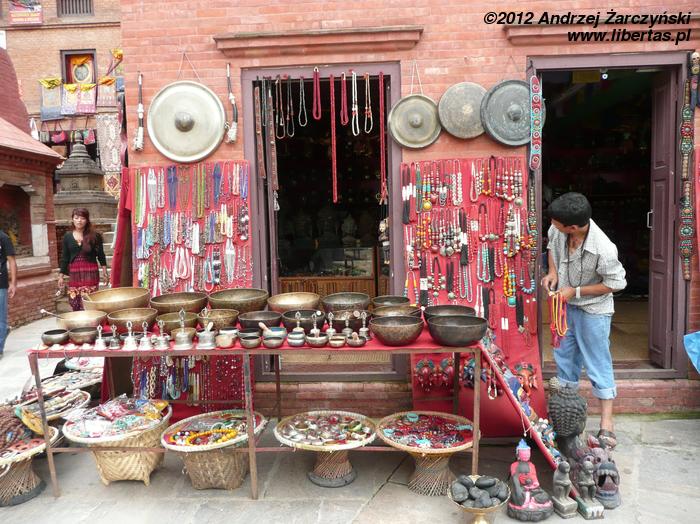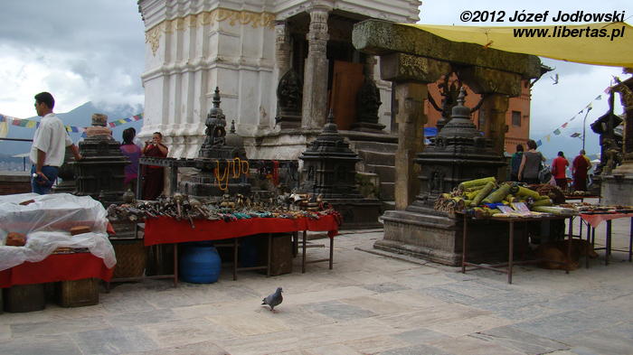 Za stupą schodami w dół schodzę do zachodniej części kompleksu. Tu kolejne stupy, posągi Buddy, dzwony, flagi modlitewne i wszędobylskie małpy. Więcej turystów, żebraków i niewielkich kramów i sklepików, w których można kupić każdą pamiątkę nie zawsze związaną ze stupą. Przed jednym z posążków Buddy tłumek młodych ludzi, którzy usiłują wrzucać monety do miseczki przed posążkiem. Odległość spora i trafiający nagradzany jest oklaskami. Dookoła rozłożyła się grupa „bankowa”, która rozmienia banknoty na bilon. Przyglądam się zawodom, rezygnuję jednak z udziału w tej konkurencji.