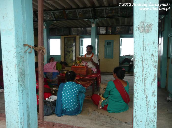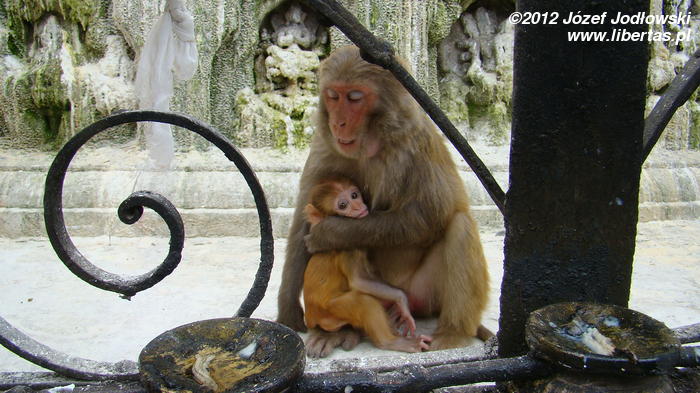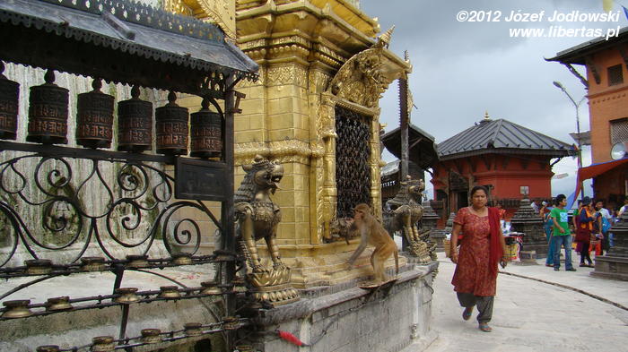 Czas na modlitwę. Obchodzę stupę zgodnie z ruchem wskazówek zegara i obracam dookoła młynki modlitewne (obracanie młynków w przeciwnym kierunku unieważnia modlitwę poprzednika). Uwalniam w ten sposób modlitwę Oṃ Maṇi-Padme Hūṃ – bądź pozdrowiony, klejnocie w kwiecie lotosu. Młynków jest 108, 108 arhatów, osób doskonałych, które wejrzały w prawdziwą naturę istnienia, wyzwoliły się z więzów pożądań, osiągnęły nirwanę i nie odrodzą się już więcej. Obracanie młynkiem daje ten sam efekt, jak ich ustne recytowanie, zaś wielokrotne jego obrócenie uważane jest za równoważne wypowiadaniu mantry na głos. Wokół stupy pięć pozłacanych kaplic poświęconych pięciu wcieleniom Buddy, przed którymi wierni modlą się i składają dary – są niemal natychmiast porywane przez niespotykane ilości małp. Jeszcze zerkam na harmikę, skąd patrzą na mnie gigantyczne źrenice – będą mi długo towarzyszyły we wspomnieniach.