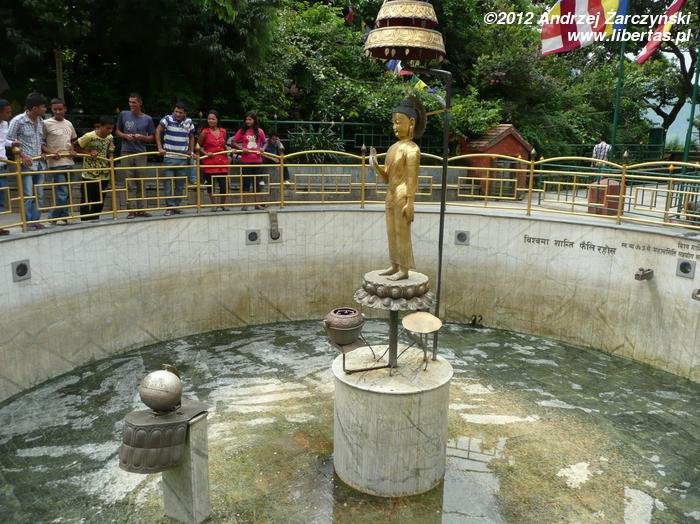 Stupę otaczają dziesiątki rzeźb, dzwonów, kaplic, małych stup wotywnych. Przysiadam na chwilę między nimi i obserwuję snujących się pielgrzymów. Mruczą swoje mantry, kręcą młynkami modlitewnymi i palą naręcza kadzideł. Przed Pałacem Pokoju grupa mnichów w szatach kasztanowego koloru. Są zwróceni twarzami w kierunku wierzchołka stupy, w skupieniu przesuwają w dłoniach koraliki mali, śpiewnie recytując słowa mantry. Mało kto zwraca na nich uwagę. Większość skupiona jest na modlitwach i być może na swoich problemach. Powagę tego miejsca „zakłócają” tylko trzepoczące na wietrze flagi modlitewne, które pokrywają całe wzgórze – jest ich mnóstwo. Buddyści wierzą, że zamieszczone na nich modlitwy wiatr rozniesie w świat i może przynieść wiele pożytku innym. Są w pięciu kolorach w kształcie kwadratu lub prostokąta, ułożonych w określonym porządku (flaga niebieska symbolizuje niebo, biała – powietrze, czerwona – ogień, zielona – wodę, a żółta jest symbolem ziemi).