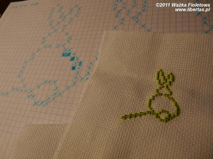 Jeśli mamy już kanwę z uroczymi królikami – zgodnie z wzorem dodajemy wstążeczkę. Nasz obrazek możemy już umieszczać na kartce.