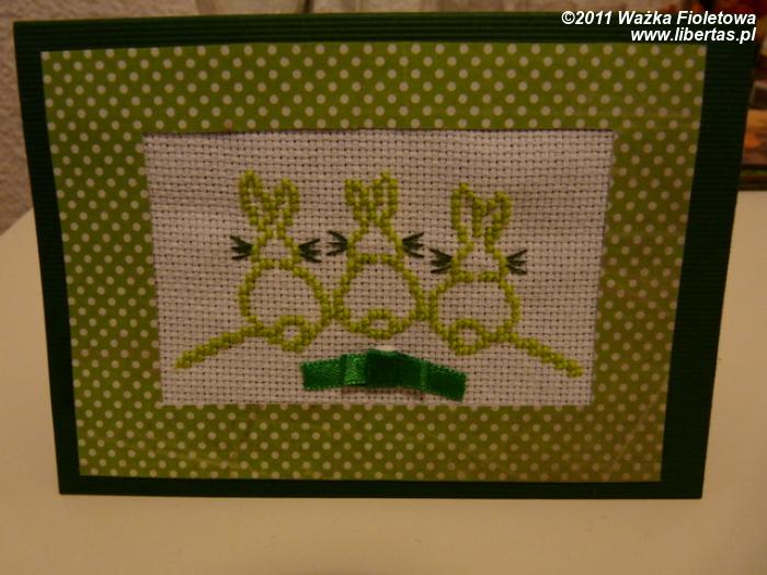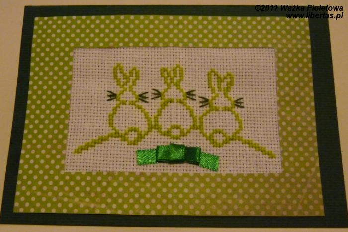 Króliki, jak widać, są wykonane haftem krzyżykowym i są wyjątkowo proste w wykonaniu – musiały takie być, ponieważ kartek zrobię więcej niż jedną.