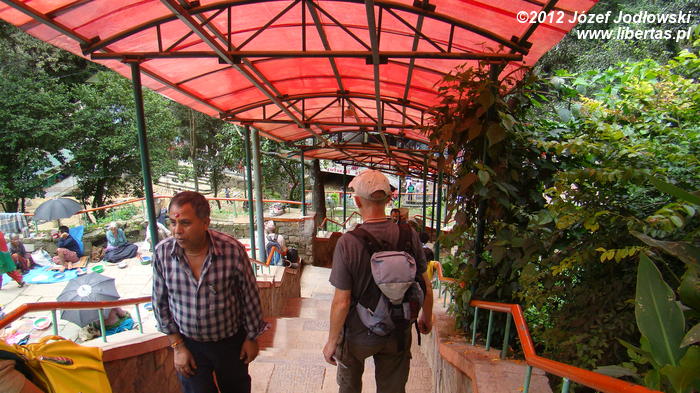 Z wioski Pharping do sanktuarium prowadzi leśna droga, wzdłuż której miejscowi kupcy na rozstawionych straganach sprzedają żywe zwierzęta, kolorowe girlandy kwiatów, kokosy, różne paciorki, kolorowe barwniki, kunkum, obrazki z hinduskimi bogami i gotowe (komercja) wypełnienie do thali lub koszyczki z darami dla bogini. Jest kilka straganów z żywnością. Słodycze, prażona kukurydza i potrawy, które trudno określić z nazwy. Na schodach prowadzących do świątyni żebracy i lokalni wieśniacy sprzedający na garści porcje surowego ryżu.