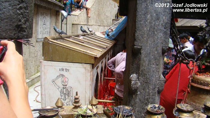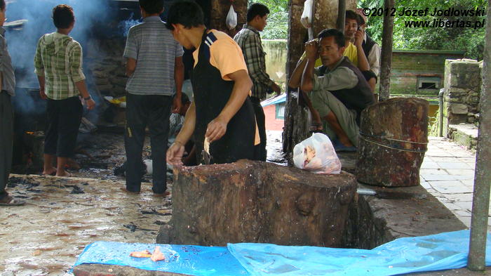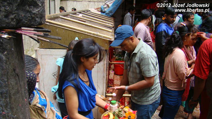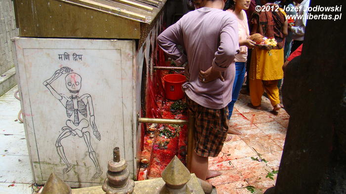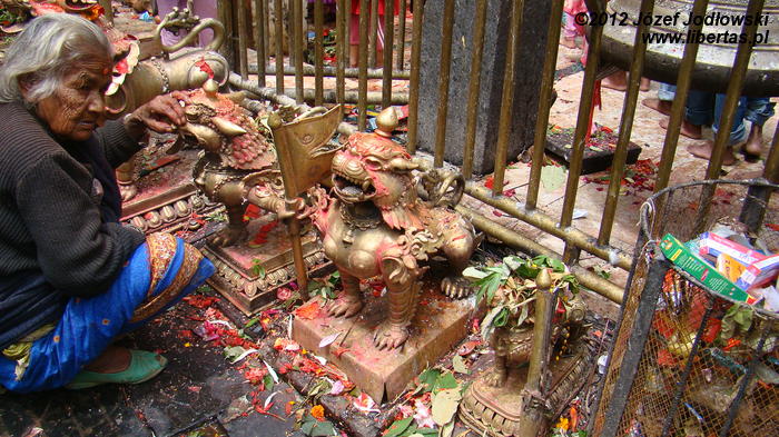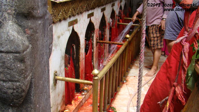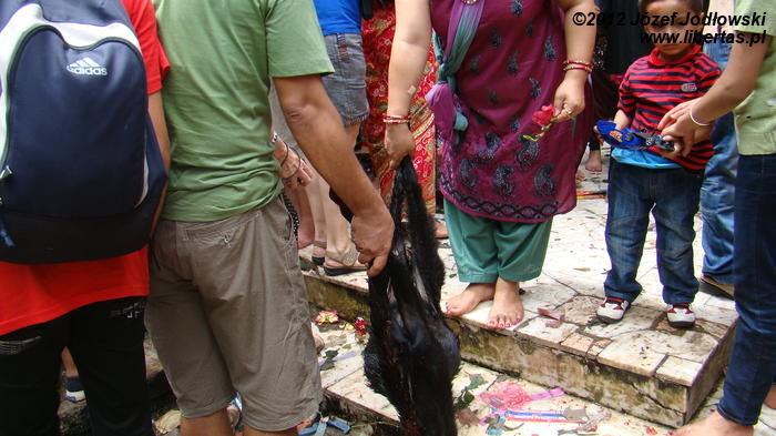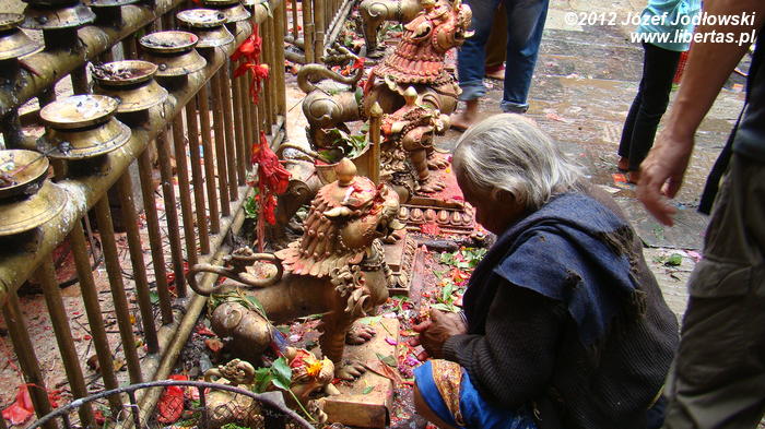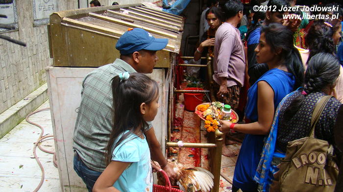 Cały rytuał jest wykonywany sprawnie i z sumiennością godną kata, tym bardziej, że żadne ze zwierząt nie oczekuje w ciszy i skupieniu na czekającą ich rzeź, a zebrani wierni przed obliczem Kali ze spokojem przyglądają się ceremonii zajęci swoimi modlitwami czy problemami. Zresztą, Hindusi wierzą, że poświęcając zwierzę, odpędzą od siebie złe moce i zapewnią sobie oraz swej rodzinie pomyślność, szczęście, zdrowie i majątek. Widok jest zaiste niecodzienny, krew leje się szerokim strumieniem, a wierni brodząc bosymi stopami we krwi, zbierają krople, które spadły na ziemię do przyniesionych pojemniczków. Porządek jest niemożliwy do utrzymania, pomimo, że co jakiś czas po terenie przechodził kapłan (może sprzątający) i gumowym wężem zmywa krew z podłogi i ścian. Na krótko, bo ilość pielgrzymów jest ogromna. Po krwawej ceremonii wierni poza świątynią zapalają kadzidła, wlewają tłuszcz ghi do palących się mosiężnych zniczy i obsypują kwiatami posążki śnieżnych lwów.