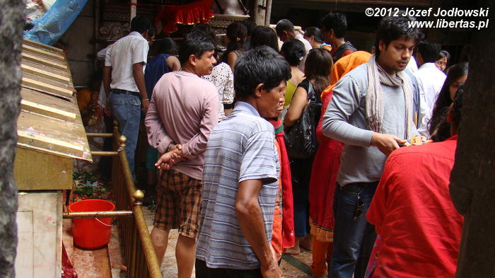 Żeby dostać się przed oblicze Kali i złożyć jej swoje dary trzeba ustawić się w długiej kolejce pielgrzymów. Część z nich w świętych strumykach skrapia przyniesione owoce, kwiaty i obmywa zwierzęta – przed ofiarowaniem ich Kali muszą być czyste.