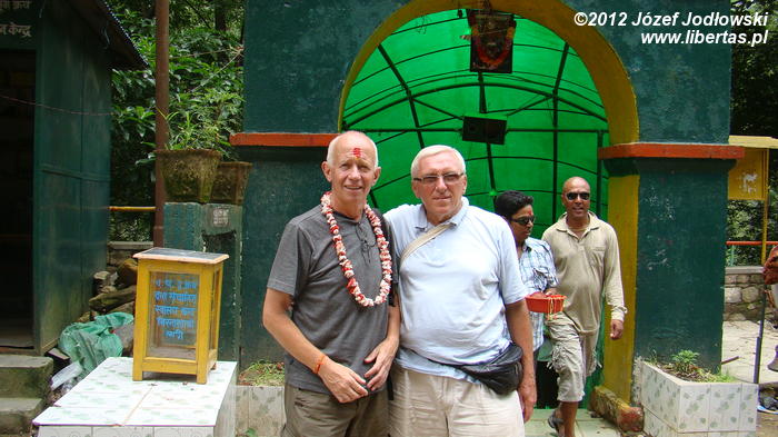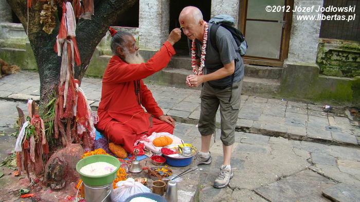 Jeszcze na zakończenie błogosławieństwo od świętych mężów sadhu, którzy rozstawiają swoje stanowiska wokół świątyni. W większości ubrani w pomarańczowe lub czerwone szaty kaszaja składające się z antarawasaka – szaty spodni i uttarasanghati – szaty wierzchniej. Na szyi zwisają im male ze 108 koralikami z radrakszy. Długie dredy lub siwe długie włosy są spięte w kok. Przystojne, ciemne twarze okalają długie siwe brody i wąsy. Siedzą na matach w pozycji lotosu. Na czole mają namalowane duże czerwone podłużne krople tilaka. Wokół siebie rozkładają pełen asortyment proszków, kunkum, dzwonki modlitewne, świecidełka, miski ryżu, girlandy kwiatów i przybory, których znaczenie prawdopodobnie znają tylko sadhu. Ceremonia jest prosta. Najpierw z długiego motka odwijają trójkolorowe nitki muliny i owijając ją wokół dłoni sporządzają kolorowe bransoletki. Następnie nakładają na szyję girlandę z kwiatów, a na czoło specjalnym pędzelkiem nakładają czerwoną i żółtą kropkę tilakę.