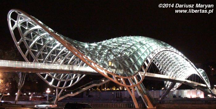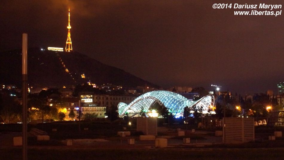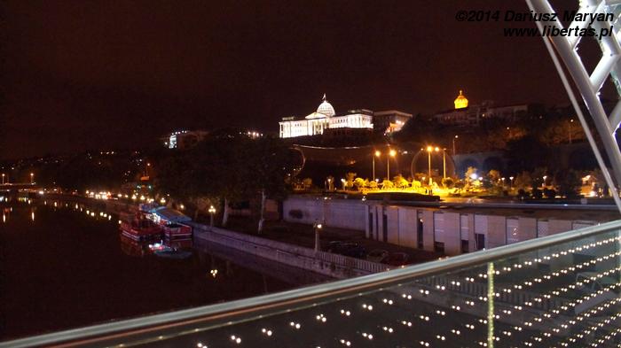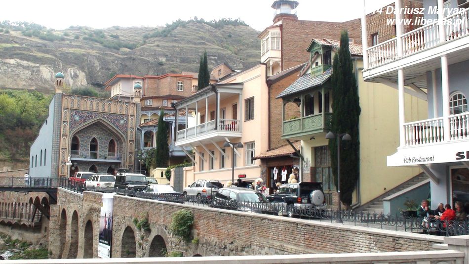 Po chwili marszu (na szczęście w dół) doszliśmy do Kury. Widok przed nami był niesamowity. Z jednej strony Stare Miasto wspinające się po zboczu w kierunku twierdzy Narikali. Pięknie odnowione budynki z balkonami, tarasami i werandami nachodzą jedne na drugie. Minaret meczetu i kopuły łaźni siarkowych. Wszystko to tworzy wspaniały klimat i stanowi o charakterze Tbilisi. Z drugiej strony tuż obok nowoczesny futurystyczny Most Pokoju, kolejka linowa i nowoczesny Pałac Prezydencki stojący powyżej równie interesującego Parku Europejskiego z jakąś zupełnie odjechaną instalacją nie wiadomo do czego służącą. To połączenie tradycji i nowoczesności, zabytkowej architektury i awangardowych obiektów jest (moim zdaniem) bardzo udane.