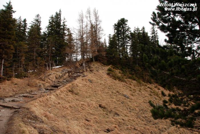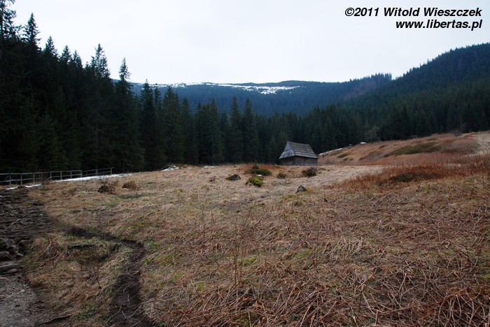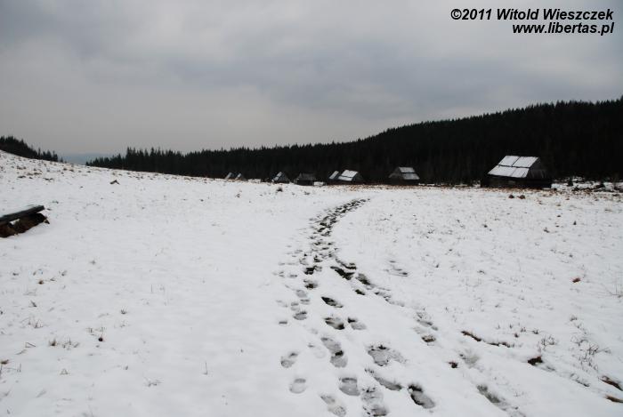 Druga wersja trasy okrąża szczyt od lewej (południowo-wschodniej) strony, prowadząc obok zabytkowych, drewnianych szałasów służących góralom, którzy wypasali tu owce. Po mniej więcej 15 minutach dochodzimy na drugi kraj polany, gdzie szlaki się łączą i prowadzą dalej do Doliny Olczyskiej.