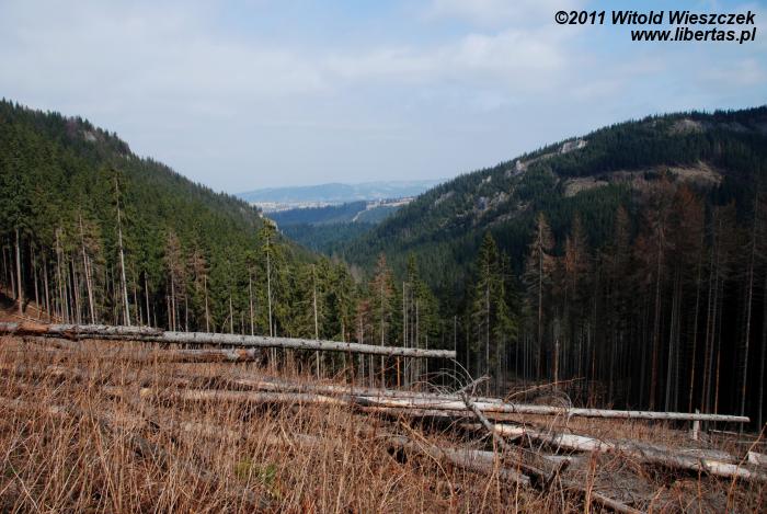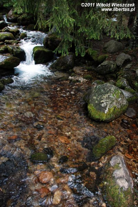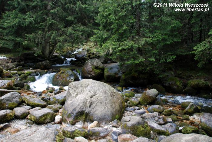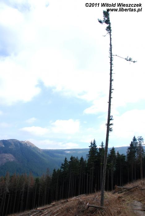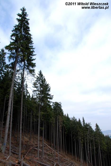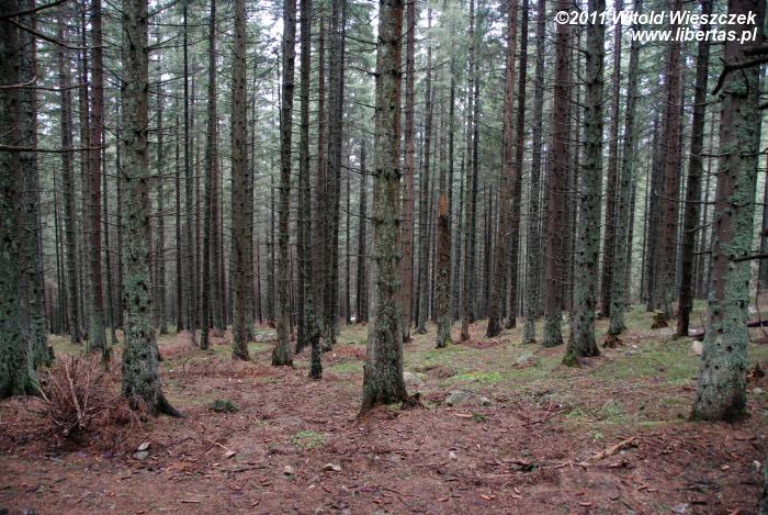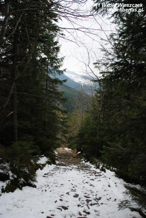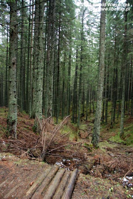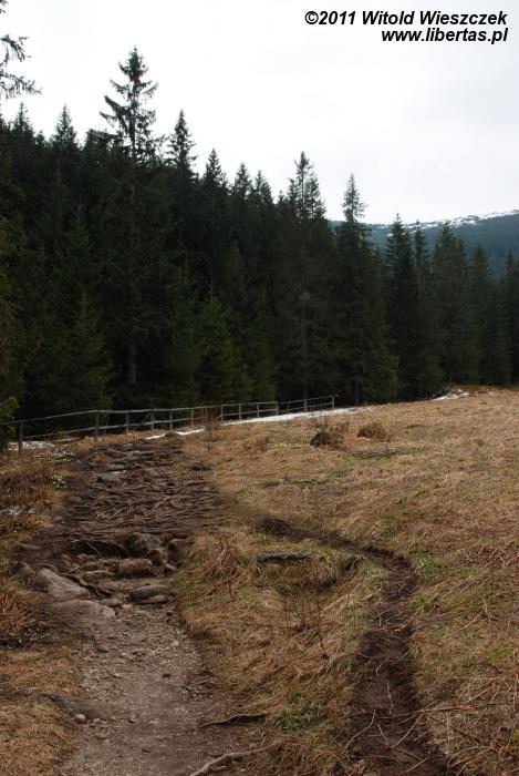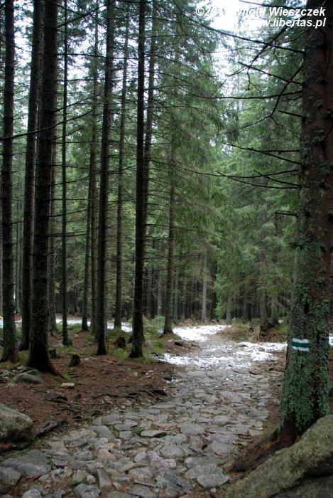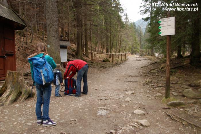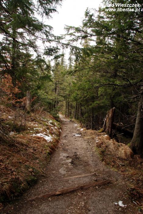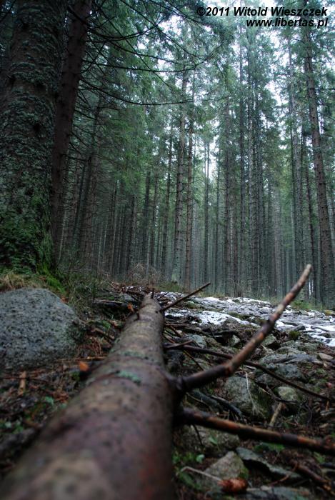 Wchodzimy w las, gdzie mniej więcej po pół godzinie marszu czerwony szlak odbija w lewo w kierunku Morskiego Oka. My idziemy nadal zielonym.