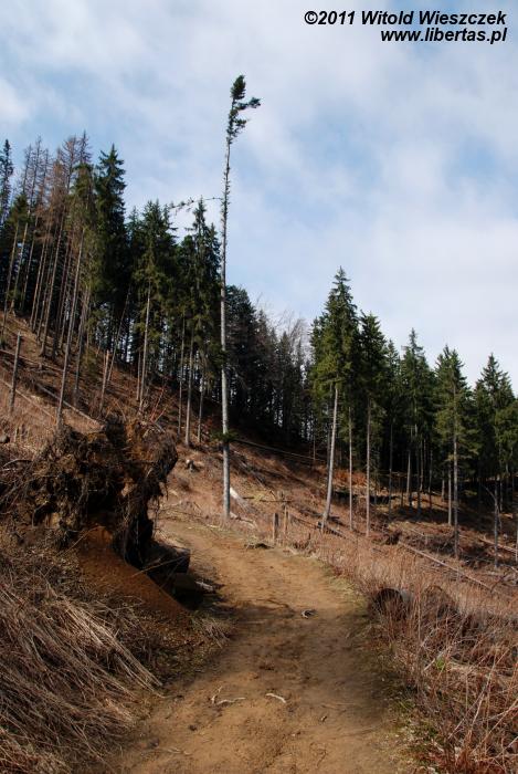Bardzo przyjemna leśna ścieżka prowadzi nas łagodnie w dół, w poprzek zbocza Suchego Wierchu. Mniej więcej po pół godzinie marszu od polany pod Kopieńcem, powinniśmy dojść do Polany Olczyskiej (1038 m n.p.m.), gdzie można chwilę odpocząć na drewnianych ławach. Jeśli mamy dość (bo np. rozpętała się właśnie straszna burza), to możemy zejść zielonym szlakiem do oddalonej o mniej więcej 2 kilometry (jakieś 35 minut) Jaszczurówki, gdzie można przy okazji obejrzeć piękną drewnianą kaplicę.