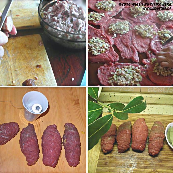 Na każdy płat mięsa kładź 2 łyżki farszu, zwiń lekko brzegi i zroluj całość. Zrolowane mięso obwiń sznurkiem lub białą nitką.