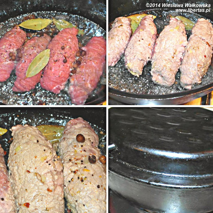 Do brytfanki dodaj łyżkę masła, 2–3 łyżki oleju, rozgrzej tłuszcz i obsmaż rolady. Do obsmażonych rolad dodaj pokrojoną w piórka cebulę, liście laurowe, ziele angielskie i pieprz. Nakryj brytfankę i włóż do nagrzanego do 190 stopni piekarnika na 1,5–2 godziny. Potem wyjmij rolady i kiedy lekko przestygną zdejmij nitki.