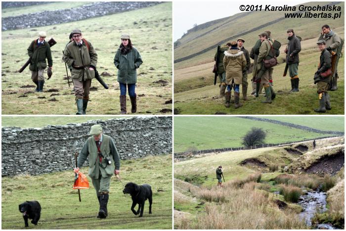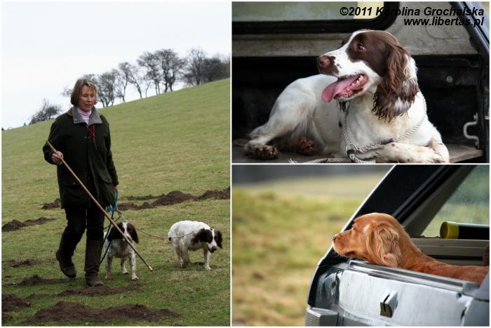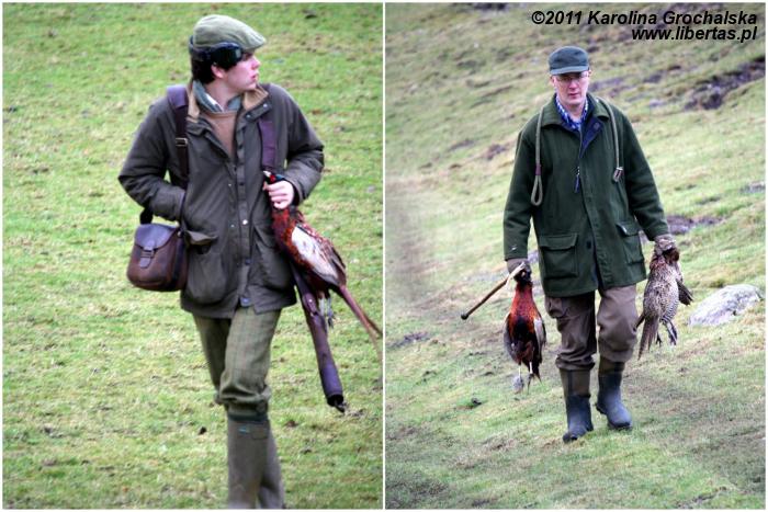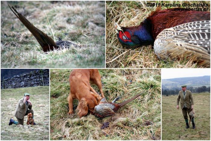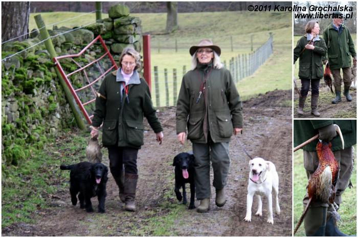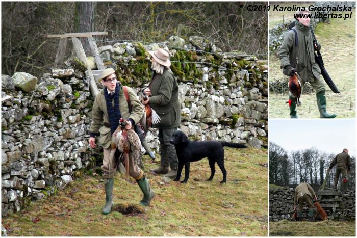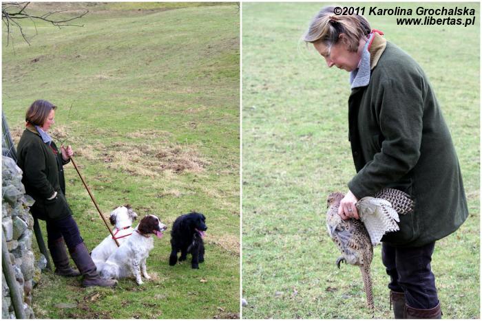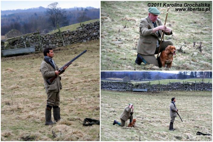 Towarzyszyły nam też psy - tradycyjnie spaniele i labradory. W Anglii labradory określa się idealnym psem myśliwskim towarzyszącym w polowaniu. Oczywiście muszą pochodzić od dobrych rodziców i być odpowiednio przeszkolone. Psy są potrzebne tym, którzy po każdej sesji przechodzą przez teren i zbierają martwe ptaki. Nic nie może być zostawione; ptaki patroszy się, czyści i część sprzedaje do lokalnych pubów, restauracji czy rzeźników. Psy są potrzebne także z innego powodu. Zdarza się, że niewprawiona strzelba zrani ptaka, ale go nie zabije. Pies, gdy pozbiera ptactwo z ziemi, zanosi je do właściciela i jeśli jakiś z ptaków jest zraniony, ale jeszcze żywy, szybkim ruchem narzędzia łamie mu się kark. Zraniony ptak pozostawiony na wolności jest skazany na długą śmierć - albo zostanie rozszarpany przez inne zwierzęta, albo się wykrwawi w bólu, albo nie będzie w stanie zdobyć pożywienia.