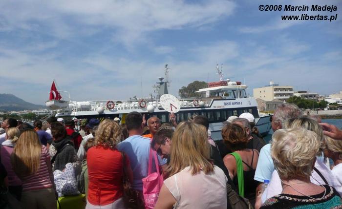 Jesteśmy w sercu tętniącym życiem – tak nazwać można port w Bodrum. Tu bowiem wszystko się zaczyna i kończy. Nieustanny ruch ludzi przemieszczających się po nabrzeżu i kołyszące się na wodzie statki, łodzie, jachty i wodoloty. Udajemy się w kierunku naszego miejsca przeznaczenia – niewielkiego pomieszczenia, gdzie uważnymi czarnymi oczami przygląda nam się mężczyzna w mundurze. Jeszcze tylko obejrzy nasze zdjęcie w paszporcie, przybije pieczęć i już możemy wsiąść na prom, który powiezie nas na grecką wyspę Kos.