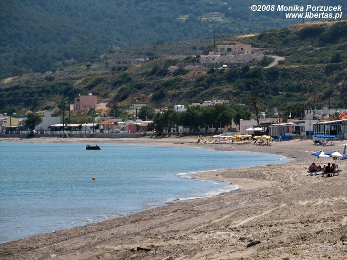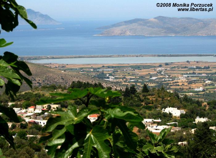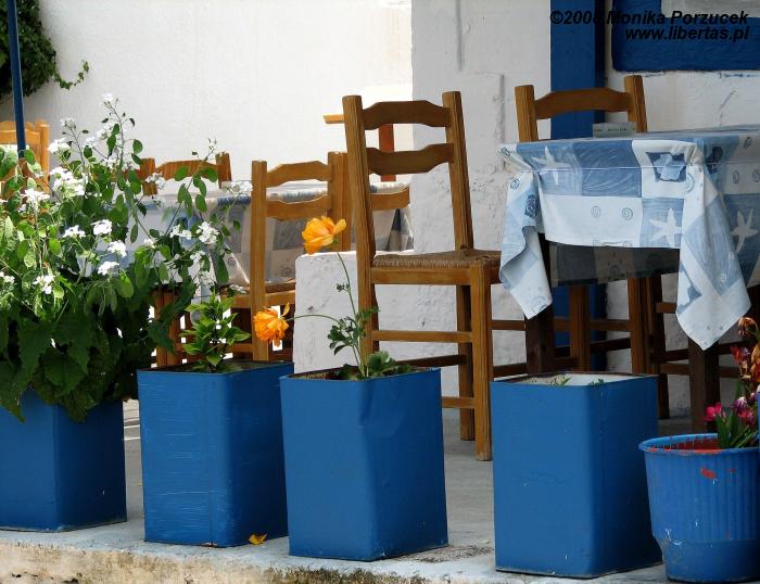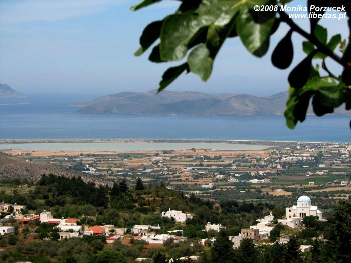 Oglądamy ruiny, niestety niewiele się zachowało, schody uświadamiają nam że szkoła zajmowała przynajmniej trzy poziomy. Z najwyższego poziomu roztacza się wspaniały widok na zatokę. Jedziemy dalej, za oknem autobusu co jakiś czas widać gaje oliwne. W górskiej okolicy zatrzymujemy się w małej wiosce gdzie funkcjonuje mały targ pełen małych pamiątek - prawie wszystkie w kolorze niebieskiego morza.. czegóż tu nie ma: dzwoneczki, talerzyki, dzbanki, ale nie czas na zakupy. Siadamy w małej kawiarence skąd roztacza się zapierający dech widok na białe domki w dole, słone jezioro i morze. Zamawiamy kawę „frappe”, czyli z kostkami lodu, mlekiem i cukrem. Jest podawana w wysokich szklankach i smakuje wyśmienicie szczególnie w gorące dni. Jedna z zamówionych pyszności miła być czarna... ale patrząc naszym okiem wszystkie kawy wyglądają jednakowo, pytamy więc kelnera która to. Kelner grzecznie wskazuje na naszego kolegę, który zamówił ”czarną”, że to właśnie ta... wybuchamy śmiechem, bo przecież humory nam dopisują.